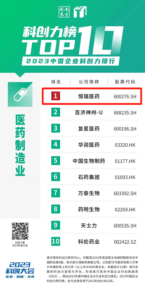 近日,南方周末科创力研究中心发布了与居民日常生活密切相关的30个行业中科创力排名前10的企业榜单。918搏天堂凭借多年来在科创领域的大力投入和优秀成果,蝉联中国企业科创力排行医药制造业榜首。